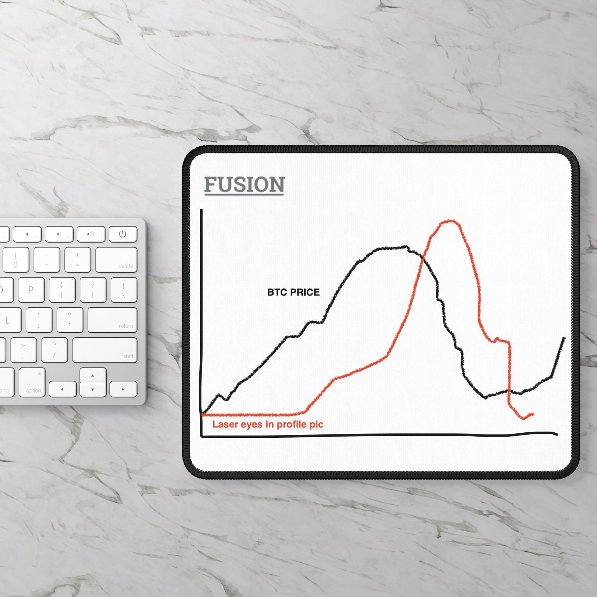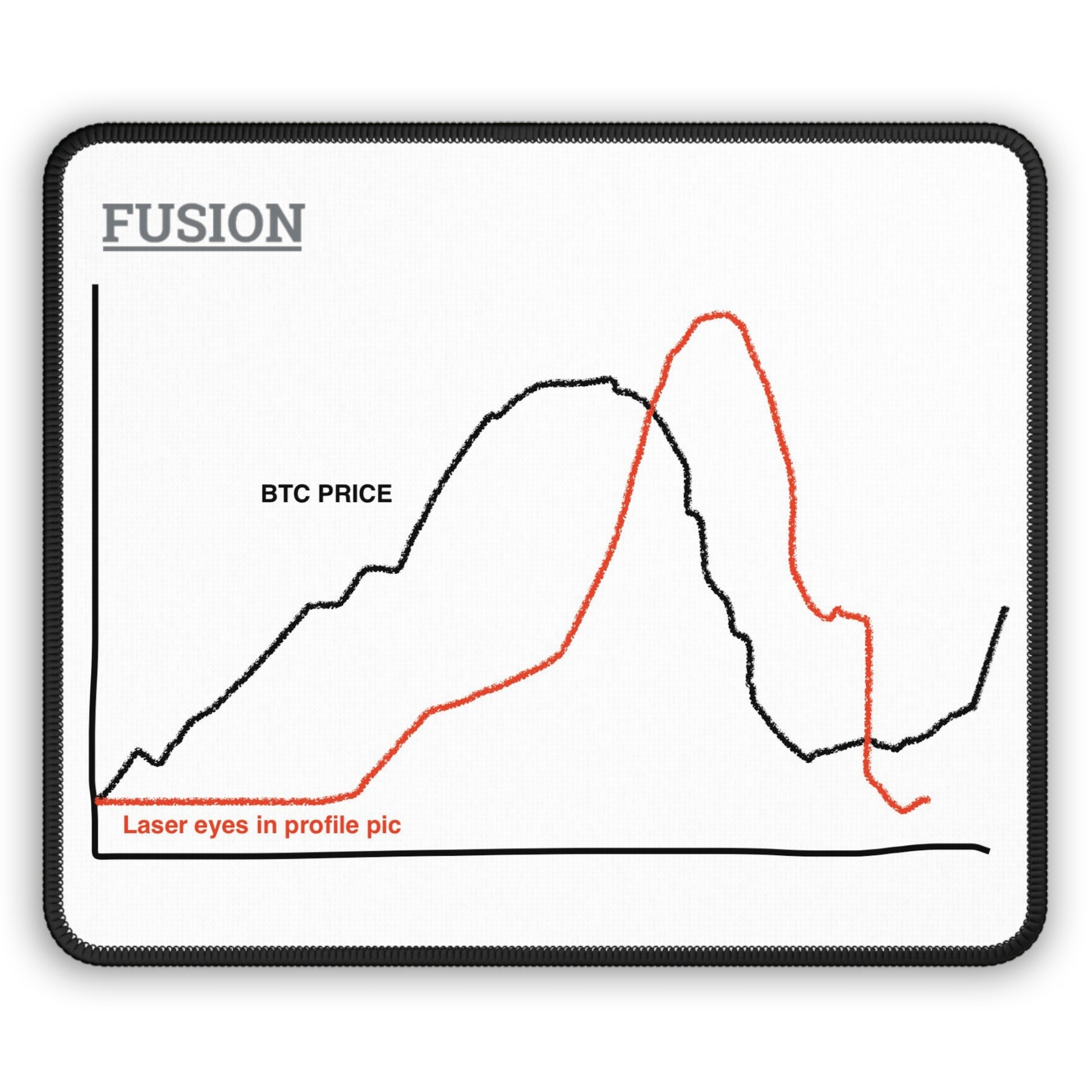 Who can forget the infamous laser eye phenomenon? Like so many sentiment trends, the crowd was late to the party—chasing the price on the way up and abandoning ship on the way down. This desk mat captures the classic cycle with humor and insight, showing how laser eyes appear after the price soars and disappear at the bottom. A perfect addition to your workspace for a daily reminder to think ahead of the crowd.
